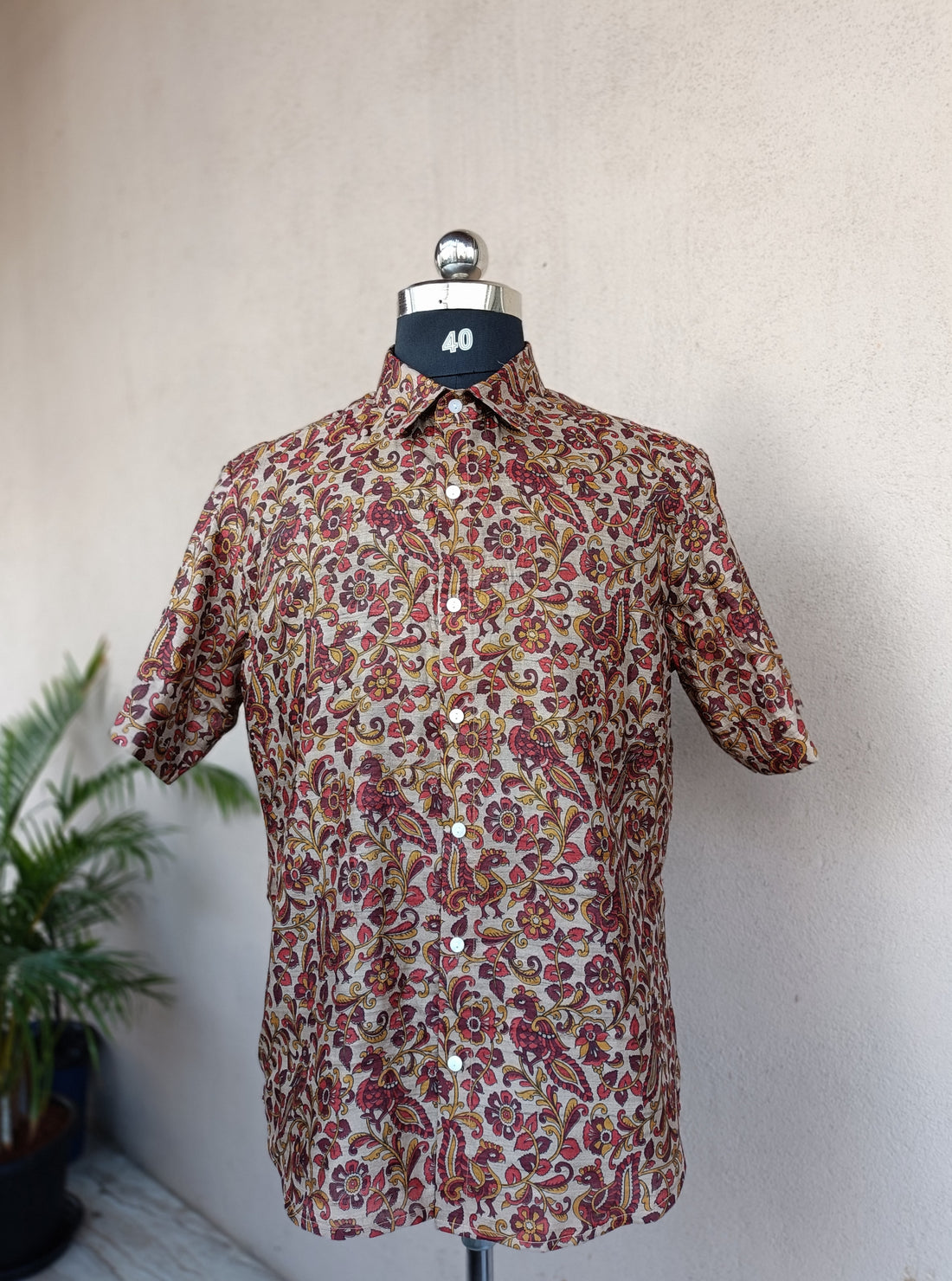 Printed half-sleeve shirt constructed with a tussar silk fabric. Designed with a classic collar, button...