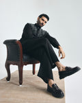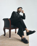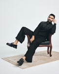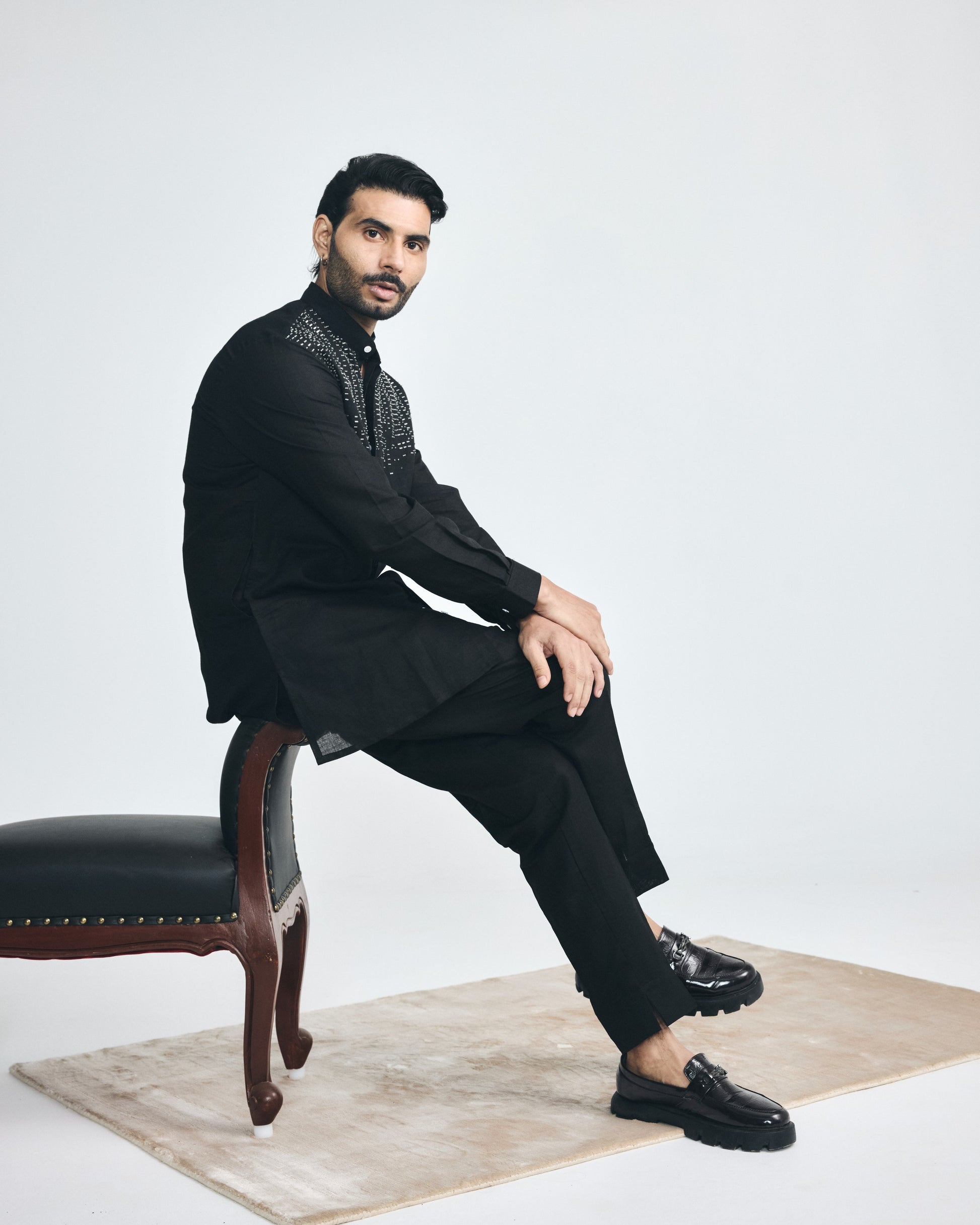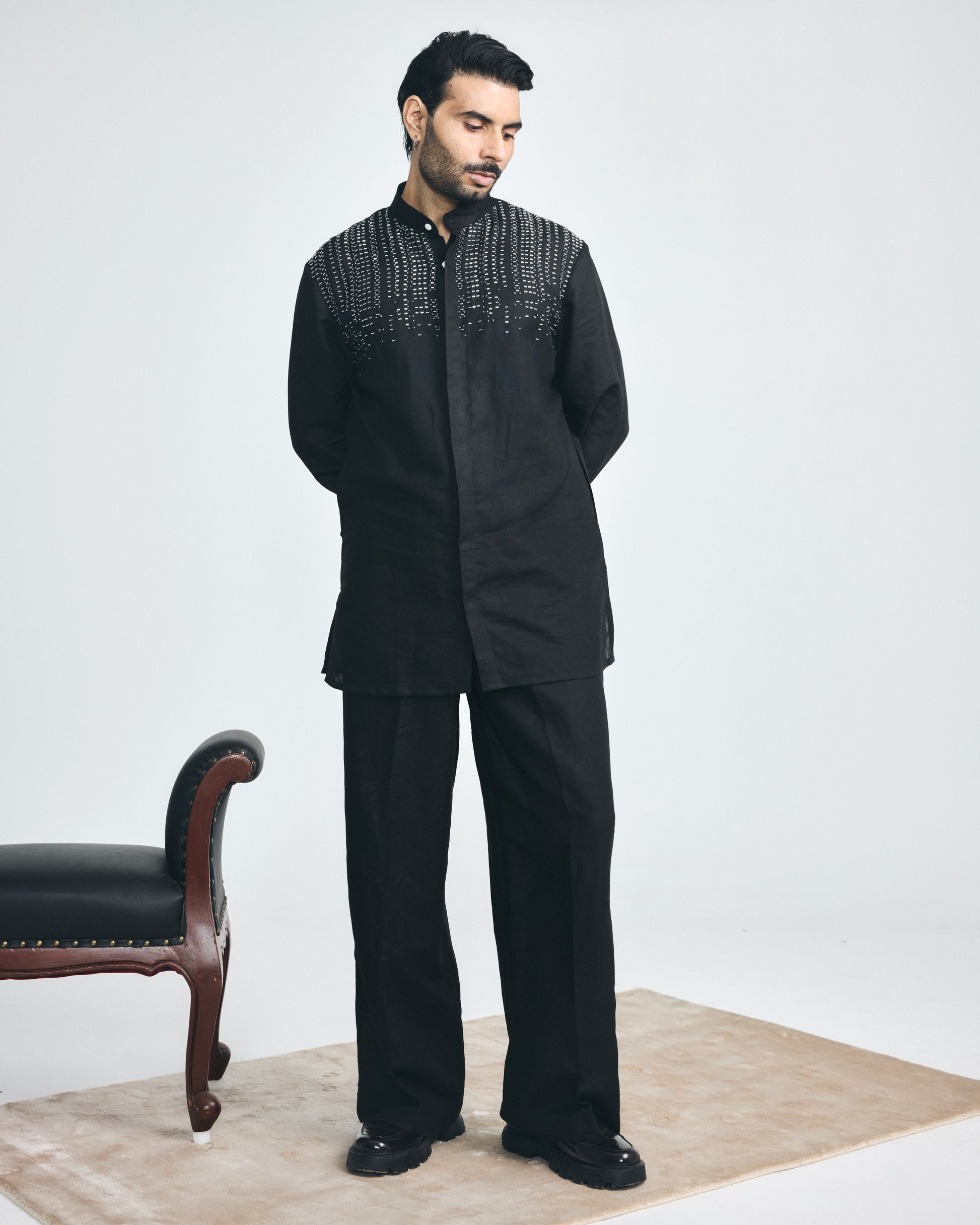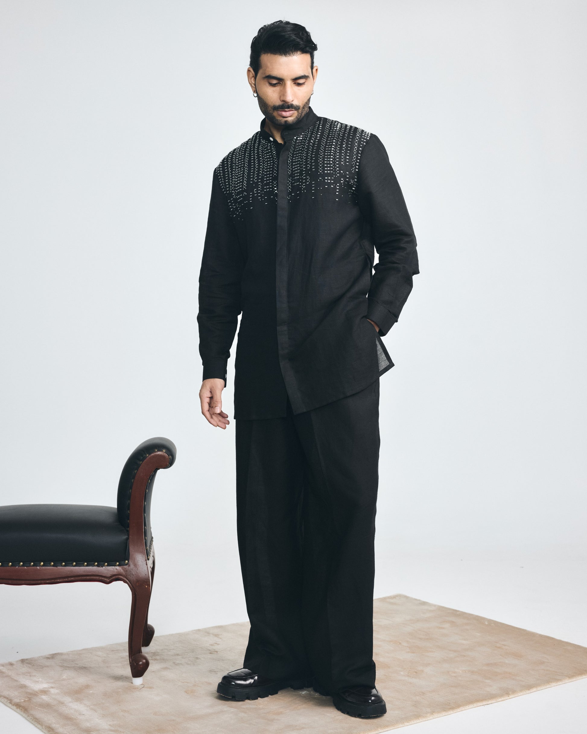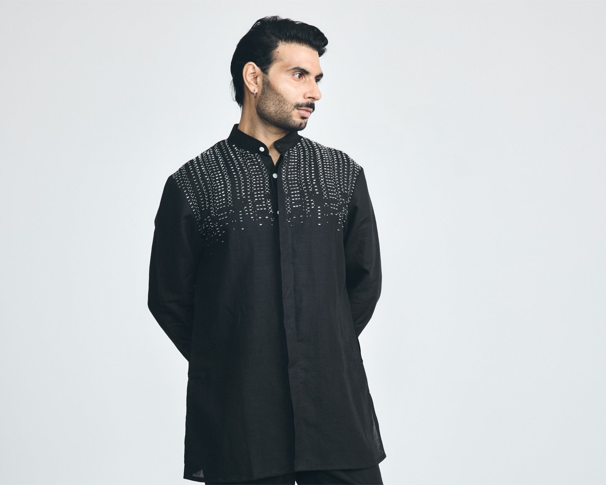 This black cotton-linen shirt-style short kurta features a mandarin collar, cuffed sleeves, and two hip pockets. This kurta has a concealed packet and is enhanced with hand-embroidered cutdana on the shoulders.